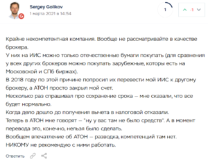 Experienced exchange gamblers recommend avoiding such brokers. They call the company incompetent and deceitful. Wanting to switch to another exchange intermediary, the client submitted a request for an IIS transfer. When trying to get a tax deduction, the trader was rejected. The firm makes an extremely negative impression, restricts its client in the choice of securities.